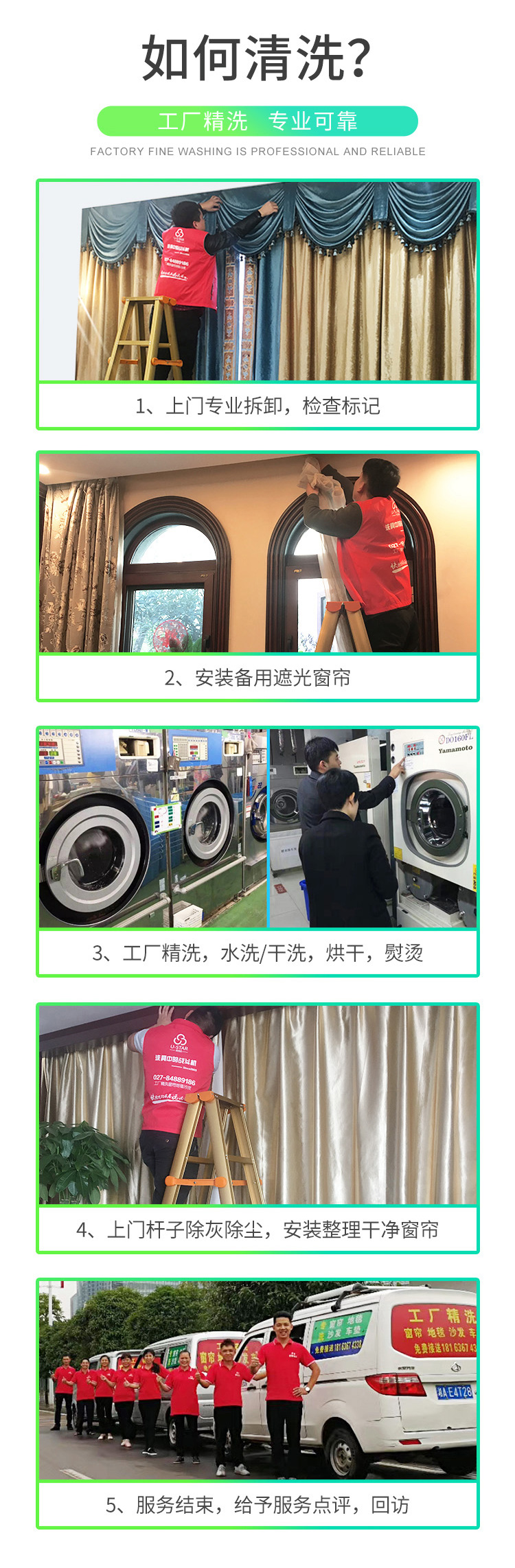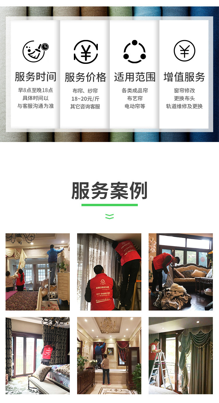 拆卸前一窗簾原形拍照一拆卸一取掛鉤一吊珠、飾品保護(hù)一特殊污漬前期處理一按顏色、材質(zhì)分開 滌(桑蠶絲,金絲絨干洗)一浸泡,預(yù)洗→主洗(配合洗滌劑、時(shí)間、溫度、機(jī)械力)→漂洗柔順劑處理一高脫甩干→烘干整燙一整理→上門安裝一整形復(fù)原。配備工具設(shè)備:大型水洗機(jī)干洗機(jī)、烘干機(jī)、整燙機(jī)、樓梯、腳手架。